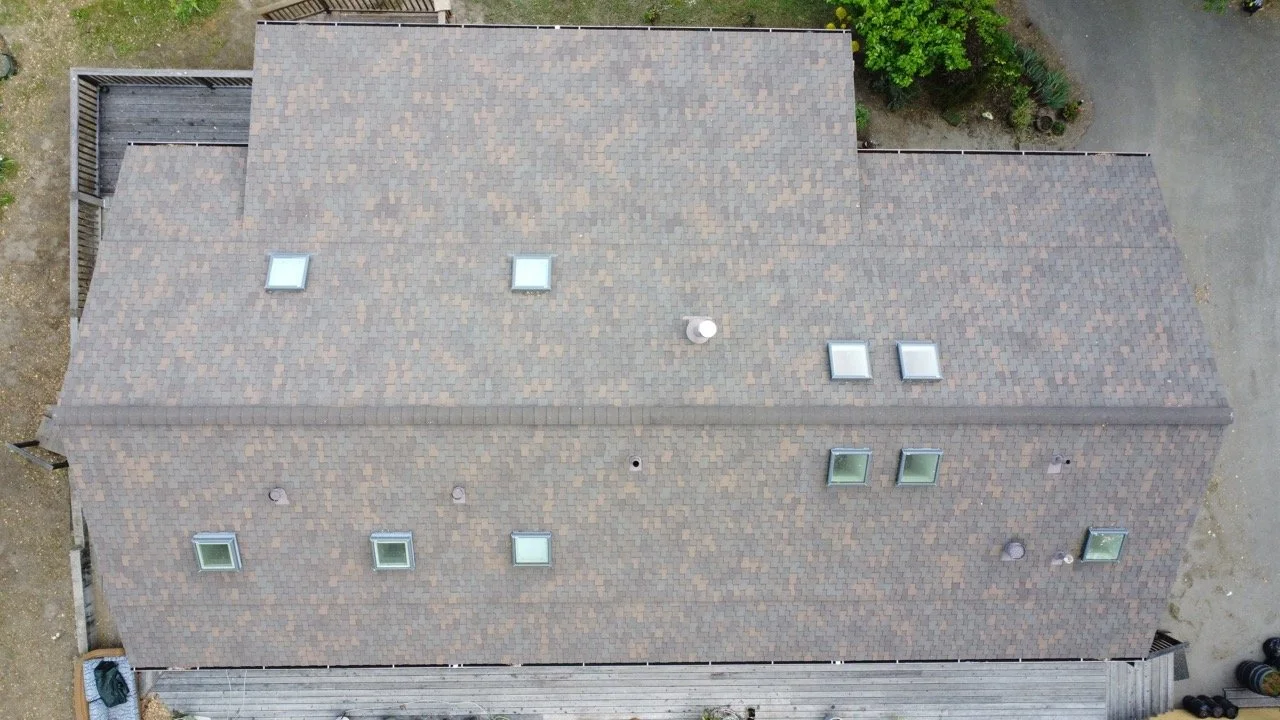 All of the vents, skylights and other protrusions on this roof are clear of debris. The galvanized flashing around each protrusion is in good shape. No leaves have accumulated against any of the skylights. The gutters are clear of leaves.