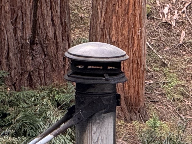 The wood stove chimney in the image above is black from age, but the spark arrestor screen is clean and in good shape. Those healthy redwood trees in the background are actually far from the house.